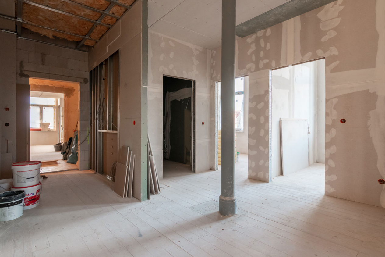 Unsere Aufgaben umfassten umfangreiche Trockenbau- und Brandschutzarbeiten vom Keller bis zum Dachgeschoss. Wir organisierten zudem alle beteiligten Gewerke für einen reibungslosen Bauablauf.